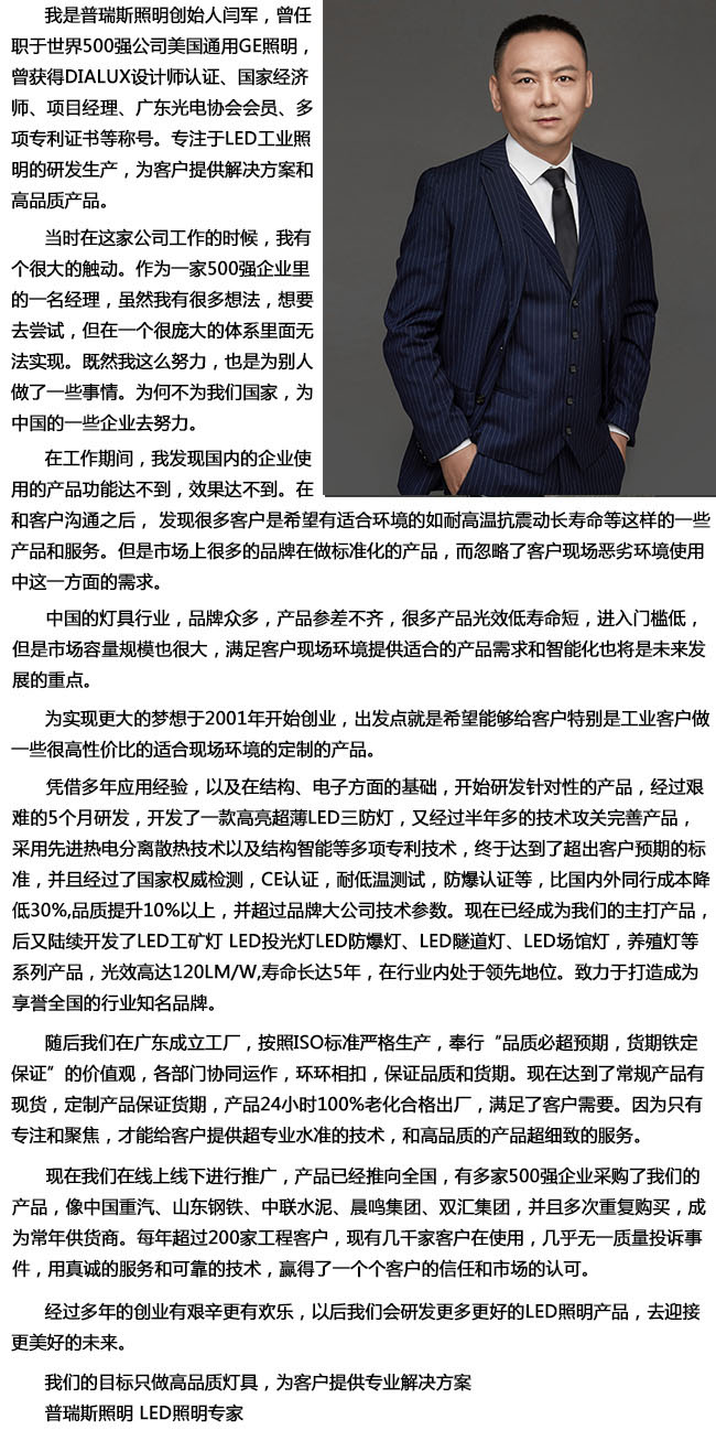 證書、防爆證書等,特色產(chǎn)品有自開模具的LED一體化三防燈、COB模組燈具等,可為各大公司OEM貼牌生產(chǎn)燈具。在行業(yè)內(nèi)處于領(lǐng)先地位。致力于打造成為享譽(yù)全國(guó)的行業(yè)知名品牌。我們的目標(biāo)只做高品質(zhì)燈具,為客戶提供專業(yè)解決方案。普瑞斯照明LED照明專家。