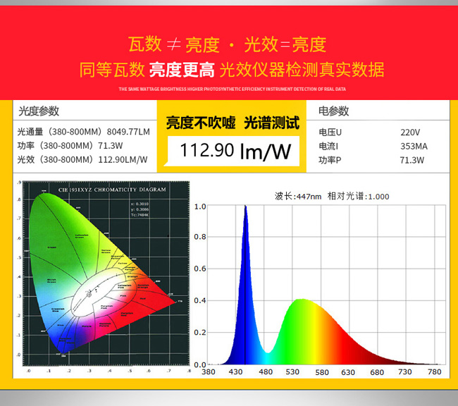 | 型號(hào) | 功率 | 光通量 | 電壓/頻率 | 色溫 | 工作溫度 | 重量 |