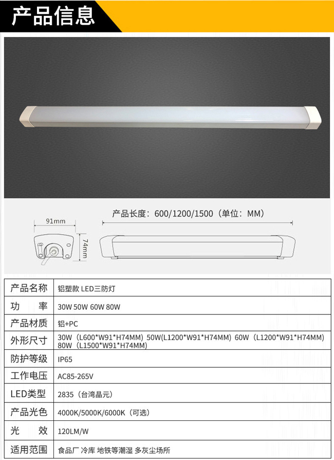 - 產(chǎn)品簡介: 產(chǎn)品特點: ?寬輸入電壓范圍,適用于任何國家、地域 ?LED光效高達100流明以上 ?高效的散熱處理,光通維持率近94% ?內(nèi)置隔離低壓恒流驅(qū)動,安全、穩(wěn)定、可靠 ?燈殼通過2500V耐壓測試; ?燈殼由阻燃硬質(zhì)PVC擠出成型,強度高、耐腐蝕、重量輕 ?安裝方便,壽命長,免維護 三防:防水、防塵、防腐,防護等級IP65 適用場所: 工廠車間、辦公室、食品廠、冷庫、商場、超市、紡織廠、防腐等場所的照明, 可完全替代傳統(tǒng)三防燈具