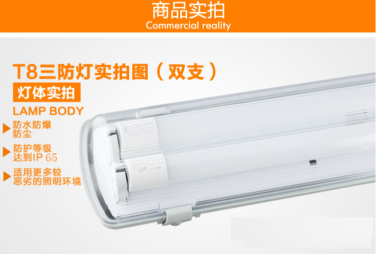 2:T8普通日光燈三防燈具,T8三防燈是一款應(yīng)用比較廣的燈具,是針對普通日光燈來設(shè)計(jì)的,有通用