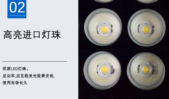 1、優(yōu)質(zhì)LED燈珠。足功率,足瓦數(shù)發(fā)光效果更佳,使用壽命長(zhǎng)久