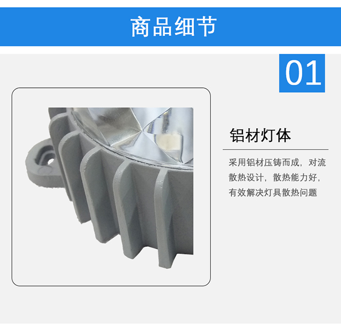 1、采用鋁材壓鑄而成,對流散熱設(shè)計(jì),散熱能力好,有效解決燈具散熱問題