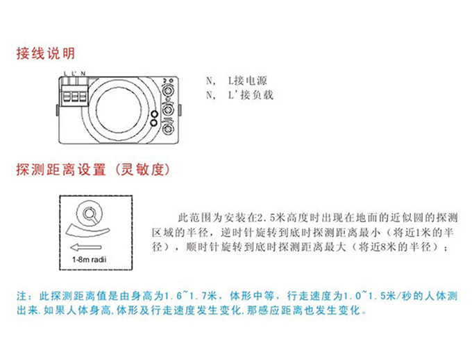 1>當有人進入感應探測范圍(直徑16m內(nèi))時,負載燈具點亮;當人穿越感應探測范圍離開且設(shè)定的延遲時間倒計時結(jié)束后,負載燈具自動熄滅。