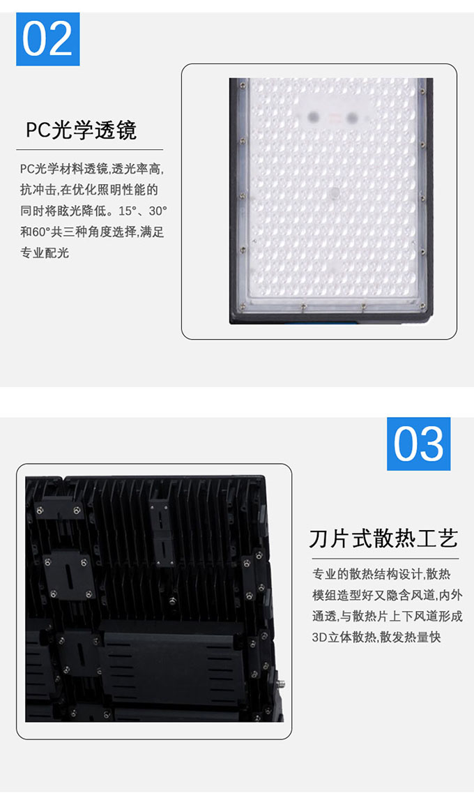 - 產(chǎn)品簡介:產(chǎn)品特點: 1、鋁材成型:釆用一體成型壓鑄工藝, 精密塑性,散熱面積大, 導(dǎo)熱性能好。 2、PC光學(xué)透鏡:PC光學(xué)材料透鏡,透光率高, 抗沖擊,在優(yōu)化照明性能的 同時將眩光降低。15°、30° 和60°共三種角度選擇,滿足 專業(yè)配光。 3、刀片式散熱工藝:專業(yè)的散熱結(jié)構(gòu)設(shè)計,散熱 模組造型好又隱含風(fēng)道,內(nèi)外 通透,與散熱片上下風(fēng)道形成 3D立體散熱,散發(fā)熱量快