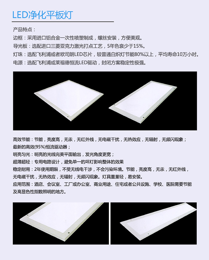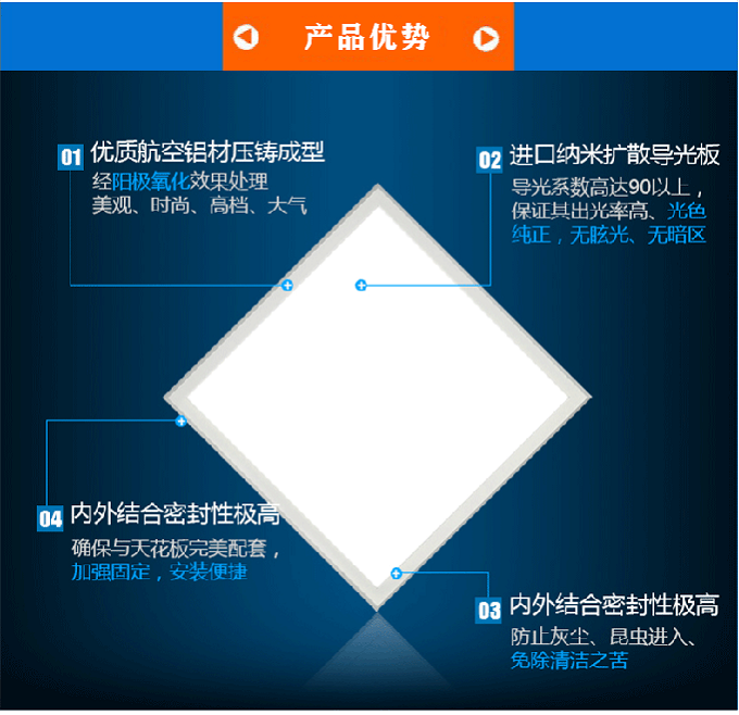 - 產(chǎn)品簡介:產(chǎn)品特點: 1.框架采用6063航空鋁,導熱系數(shù)好,散熱快,減少整燈光衰。 2.直邊設(shè)計,不積塵,易清潔,同時可以有效減少空氣對流阻力,使室內(nèi)空氣更清新。 3.燈珠采用2835型號,264珠,不滿載使用,工作電流45MA,較少整燈光衰。 4.導光板采用3MM曰本三菱板材/臺灣奇美板材,光效好,均勻度好,不會隨著使用時間出現(xiàn)發(fā)黃或中間暗兩邊亮的現(xiàn)象。 5.擴散板采用PS材料,抗沖擊力強。 6.電源采用進口IC,防水灌膠處理,更好的散熱,無頻閃,不易產(chǎn)生視覺疲勞,適合好精度或長時間工作者。 7.