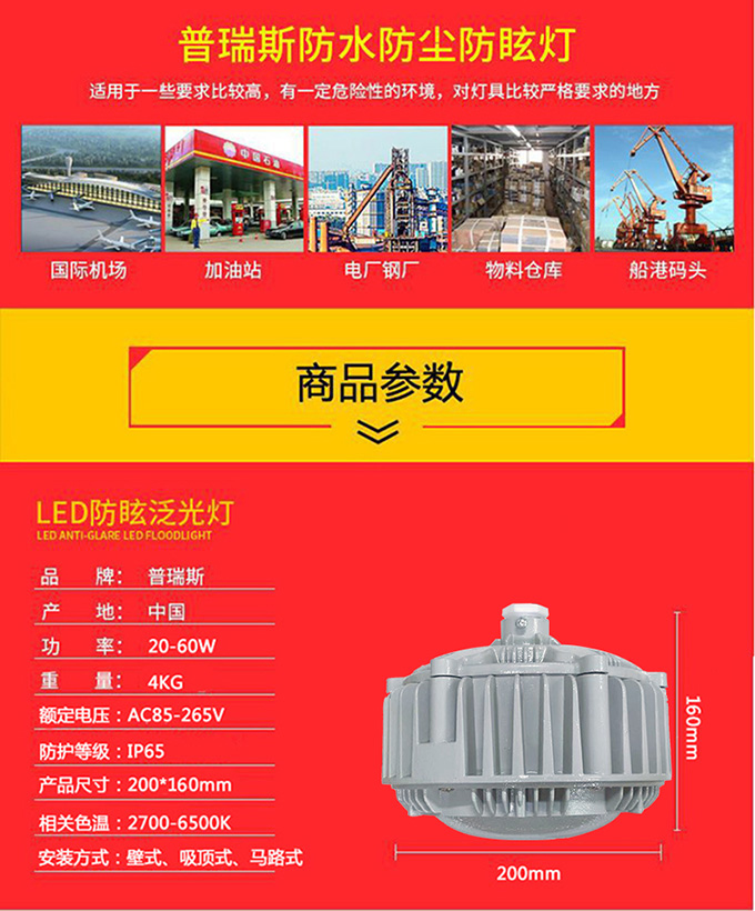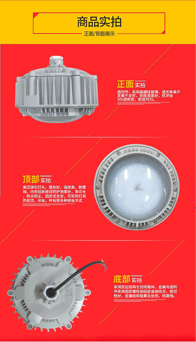 - 產(chǎn)品簡(jiǎn)介:產(chǎn)品特點(diǎn): 1.LED光源,光效高,替代傳統(tǒng)金鹵防眩燈。 2.運(yùn)用先進(jìn)的光學(xué)和照明原理優(yōu)化設(shè)計(jì)透明件,光線柔 和,照度均勻,無眩光,無重影,能有效避免作業(yè)、 施工人員產(chǎn)生不適合疲勞感。 3.選用高強(qiáng)度鋁合金外殼,進(jìn)行特殊的密封和表面涂層 處理,防護(hù)等級(jí)IP66,可在高溫潮濕和各種腐蝕性等 惡劣條件下長期使用。 4.座式、吸頂式和側(cè)壁吸式等多種安裝力式,適應(yīng)不同的工作環(huán)境。