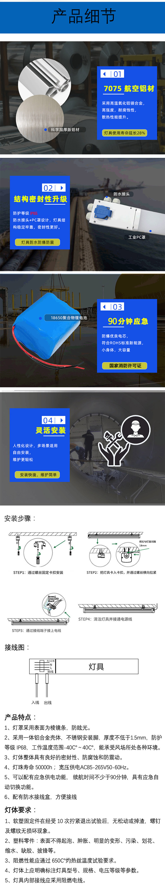 - 產(chǎn)品簡介:1、燈罩采用表面為棱鏡條,防眩光。 2、采用- -體鋁合金殼體,不銹鋼安裝腳,厚度不低于1.5mm,防護 等級IP68,工作溫度范圍-40C° ~ 40C*,能承受風(fēng)場所處各種環(huán)境。 3、燈體整體具有良好的密封性、防腐蝕和防震動。 4、燈珠壽命50000h ;寬壓供電AC85- 265V50- 60Hz。 5、可以配有應(yīng)急供電功能,續(xù)航時間不少 于90分鐘,具有應(yīng)急自 動切換功能。 6、配有防水接線盒,方便接線